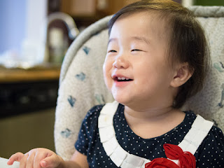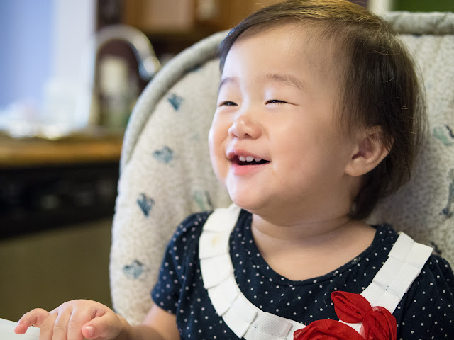 Now. Before you call social services. Let me put this into context. We're not exhibitionists running around the house naked at all times of the day. We're asian. (We don't even like walking from the bathroom to the bedroom naked, and we have an ensuite. My grandmother tells me not let baby be naked, because she's a girl and needs to be modest. SHE'S A BABY!! is usually what I say to grandma.) So, my husband had just come out of the shower and was toweling off and had left the bathroom door open to let out the steam. Little asian baby happened to walk into the bathroom and saw daddy there. When I happened upon her, she was standing pointing and well.... was...umm...giggling.